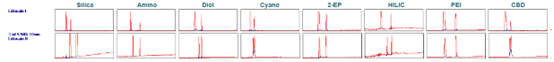 共洗脱发生在二醇相和 2-EP 相。硅胶,CBD,氰基和氨基相没有表现出理想的选择性,因为没有基线分离可以在这里实现。HILIC和PEI相表现出良好的选择性和分辨率,因为分辨率总是高于1.5(见表1)。1.5的分辨率意味着两个峰可以很好地分离。表1 也显示了洗脱顺序。氰基相呈现出相反的洗脱趋势,对氨基酚先被洗脱,对乙酰氨基酚后被洗脱。筛选结果表明,该反应并非 100% 完成,产物中仍存在大量对氨基酚。