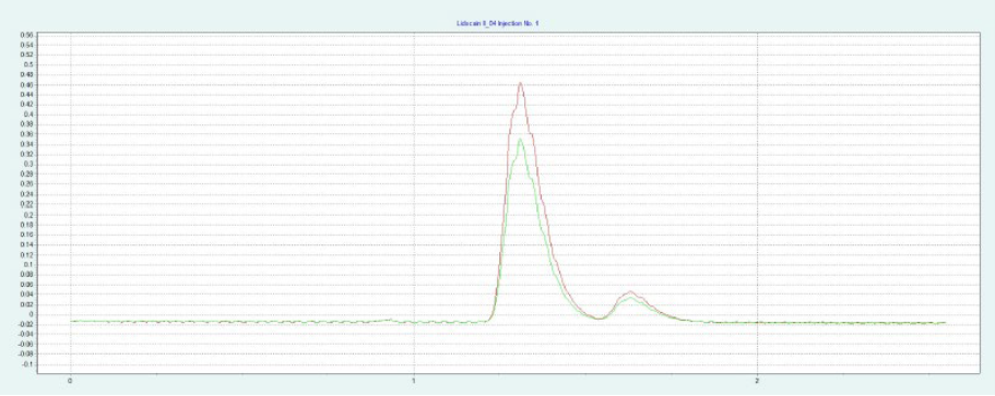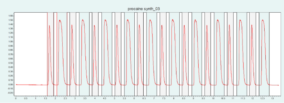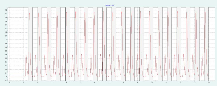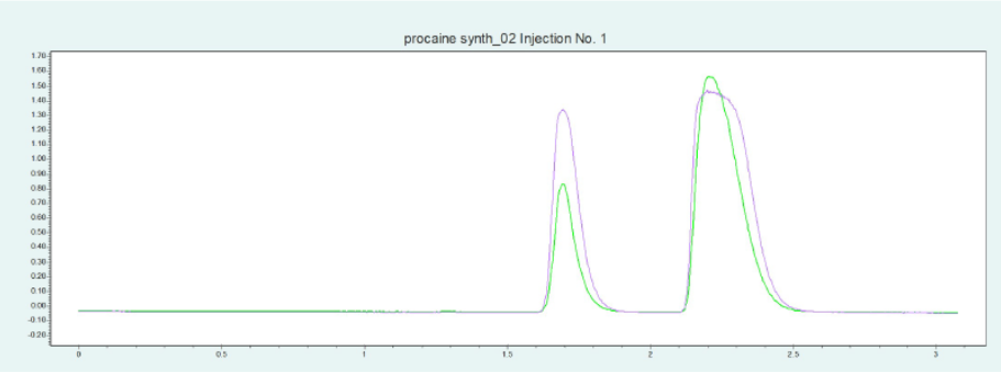 ▲ 图10. 普鲁卡因纯化的单次进样(上)和叠层进样(下);运行条件:流量= 20 mL/min,改性剂=甲醇/水(95/ 5%),含20 mm氨水,改性剂% = 25%,温度= 40℃,背压调节器 = 150 bar,进样量= 100 μL,紫外波长= 220 nm;叠层进样条件:注射次数= 10次,叠层时间= 1.1 min,色谱峰收集= 2(以时间为基础)。