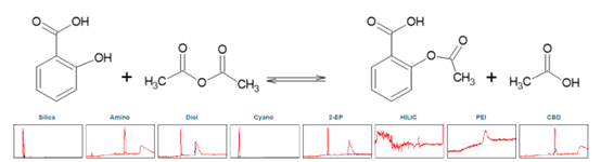 ▲ 图5. 上:乙酰水杨酸合成反应方程,下:Sepmatix 8x SFC筛选结果;从左到右依次为:硅胶、氨基、二醇、氰基、2-EP、HILIC、PEI和CBD;运行时间= 15分钟。
