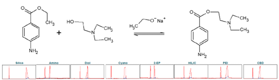 ▲ 图9. 上:普鲁卡因合成反应方程,下:Sepmatix 8x SFC筛选结果;从左到右依次为:硅胶、氨基、二醇、氰基、2-EP、HILIC、PEI和CBD;运行时间= 15分钟。